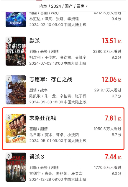 2024年,由他主演的喜剧《末路狂花钱》狂揽7.8亿元票房,跻身年度国产片票房前十,甚至打败了徐峥、陈思诚、乌尔善的导演作品。这一年,贾冰很忙,从年头到年尾,都有他的身影,一年参演15部电影,不知不觉,他已经成了拥有154亿元电影票房的国民级演员了。甚至就这一数据来说,超过了147.5亿元的成龙和127.7亿元的古天乐。
